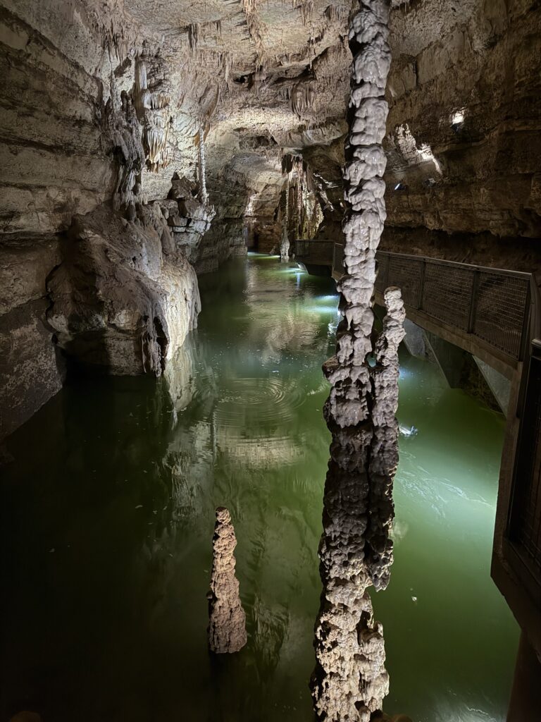 We made sure our internal team – many of whom don’t go in the cave because they are working the ticket booth or food and beverage –  could leave their posts and go see this incredible view. We are still digging through the hundreds of photos team members took, all showing our cavern with crystal clear water, an echo of the rainfall from up above, flowing through cracks, crevices, and the thinnest of openings in the limestone layer.