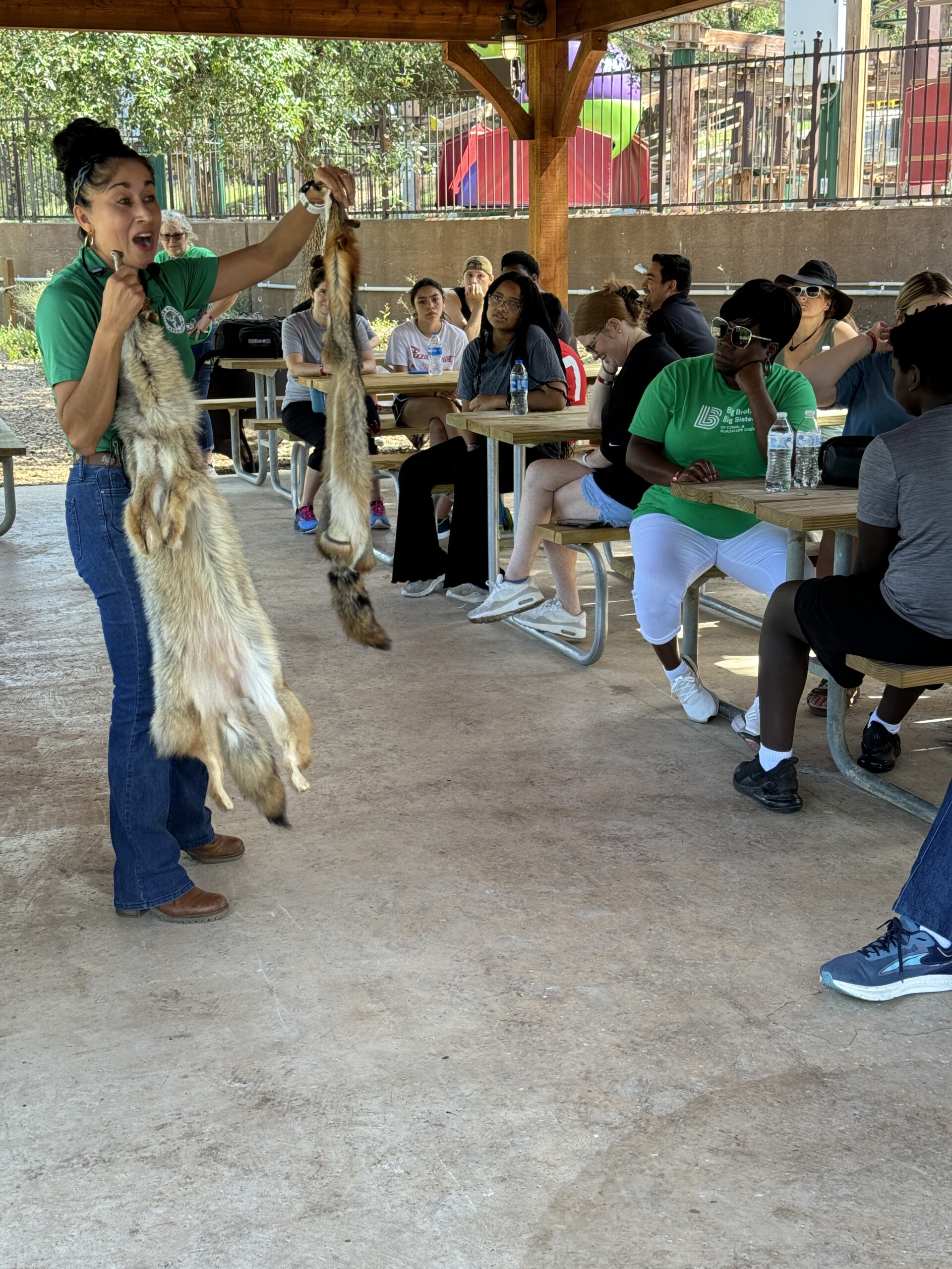 Educator from Texas Wildlife Association talks about pelts and more to a group from Big Brothers and Big Sisters during Natural Bridge Caverns 60th anniversary celebration.